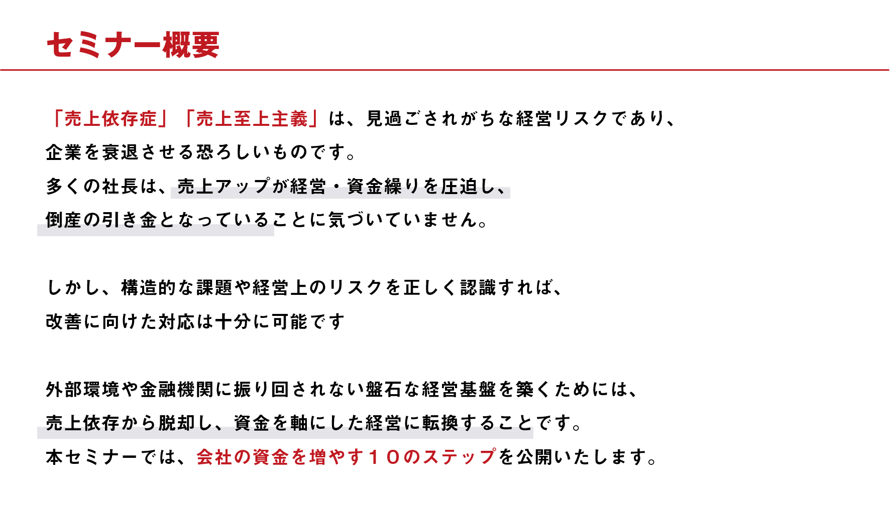 売上依存脱却セミナー ~会社のお金を増やす10のステップ~ FacebookXBlueskyCopy 対象 経営者・役員・後継者(候補)限定 料金 無料 備考 コンサルタント会社・会計事務所などの同業他社様の参加はご遠慮いただいております。 このセミナーに申し込む 開催場所 日時 東京 11月20日(木)14:00~17:00 東京 12月15日(月)14:00~17:00 東京 1月19日(月)14:00~17:00 東京 2月24日(火)14:00~17:00