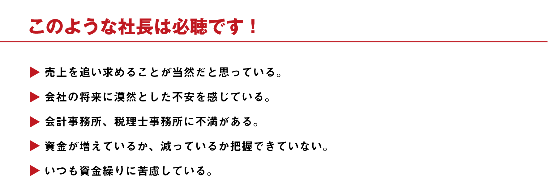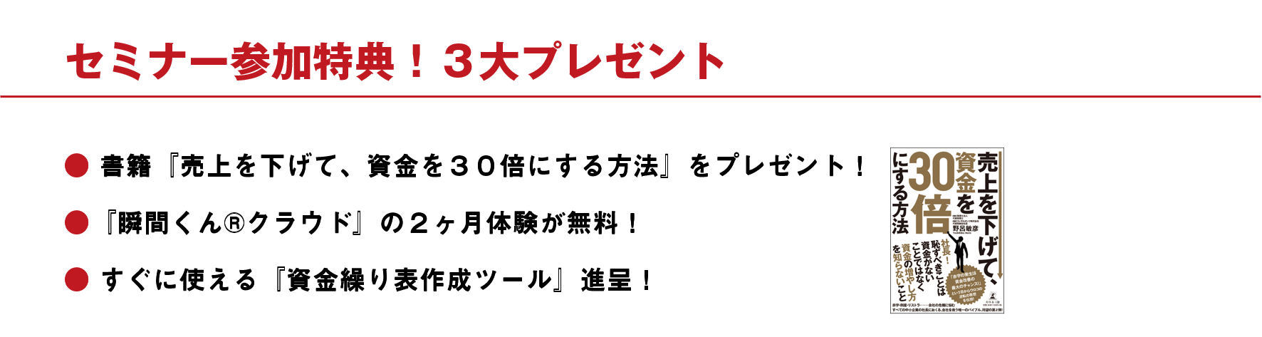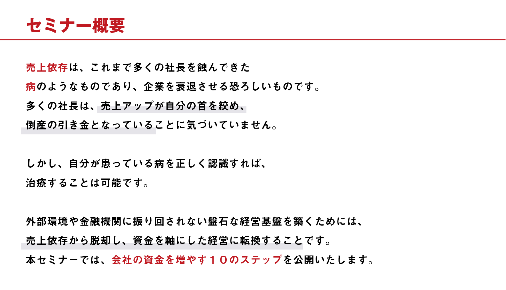 売上依存脱却セミナー ~会社のお金を増やす10のステップ~ FacebookXBlueskyCopy 対象 経営者・役員・後継者(候補)限定 料金 無料 備考 コンサルタント会社・会計事務所などの同業他社様の参加はご遠慮いただいております。 このセミナーに申し込む 開催場所 日時 東京 11月20日(木)14:00~17:00 東京 12月15日(月)14:00~17:00 東京 1月19日(月)14:00~17:00